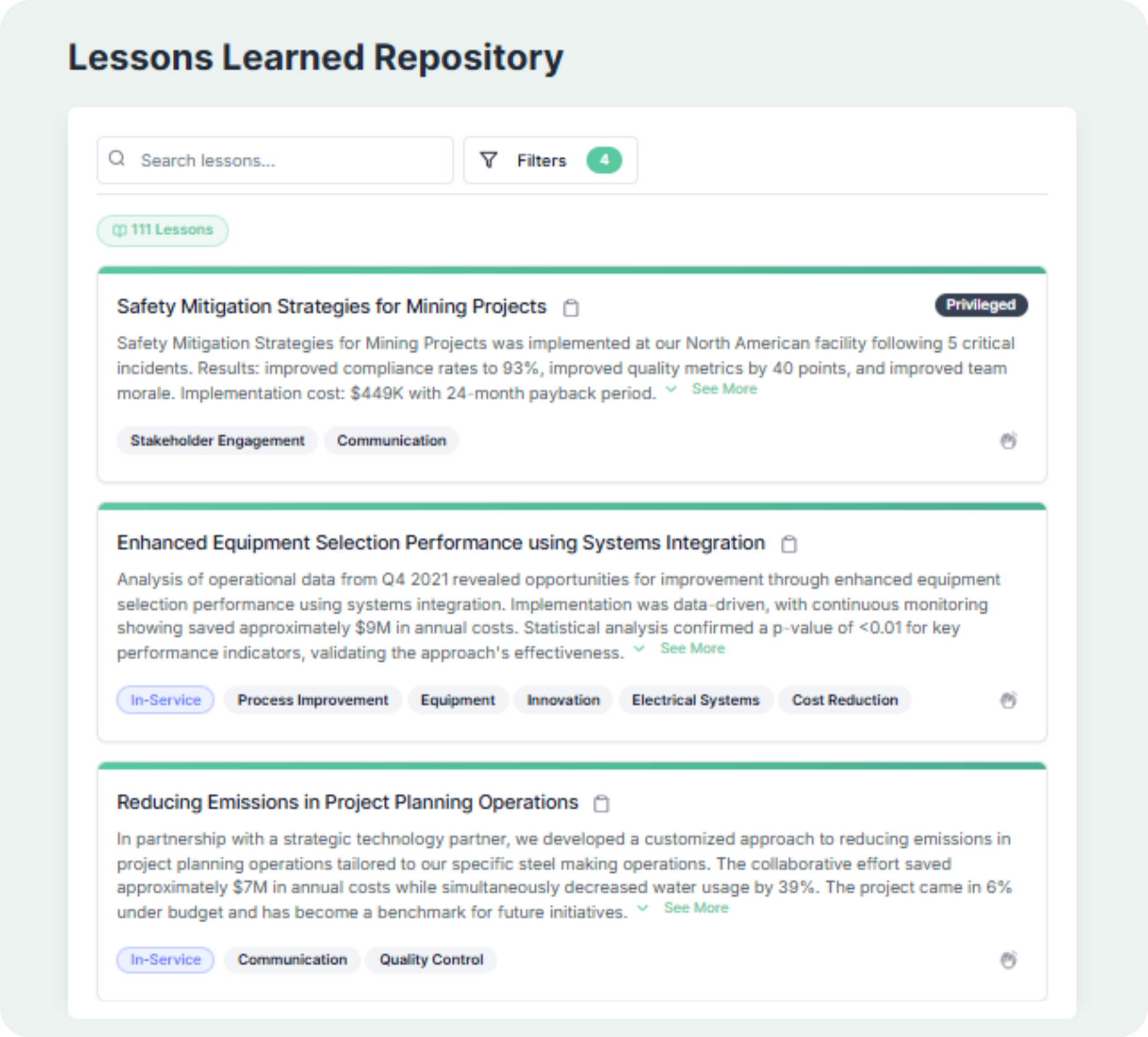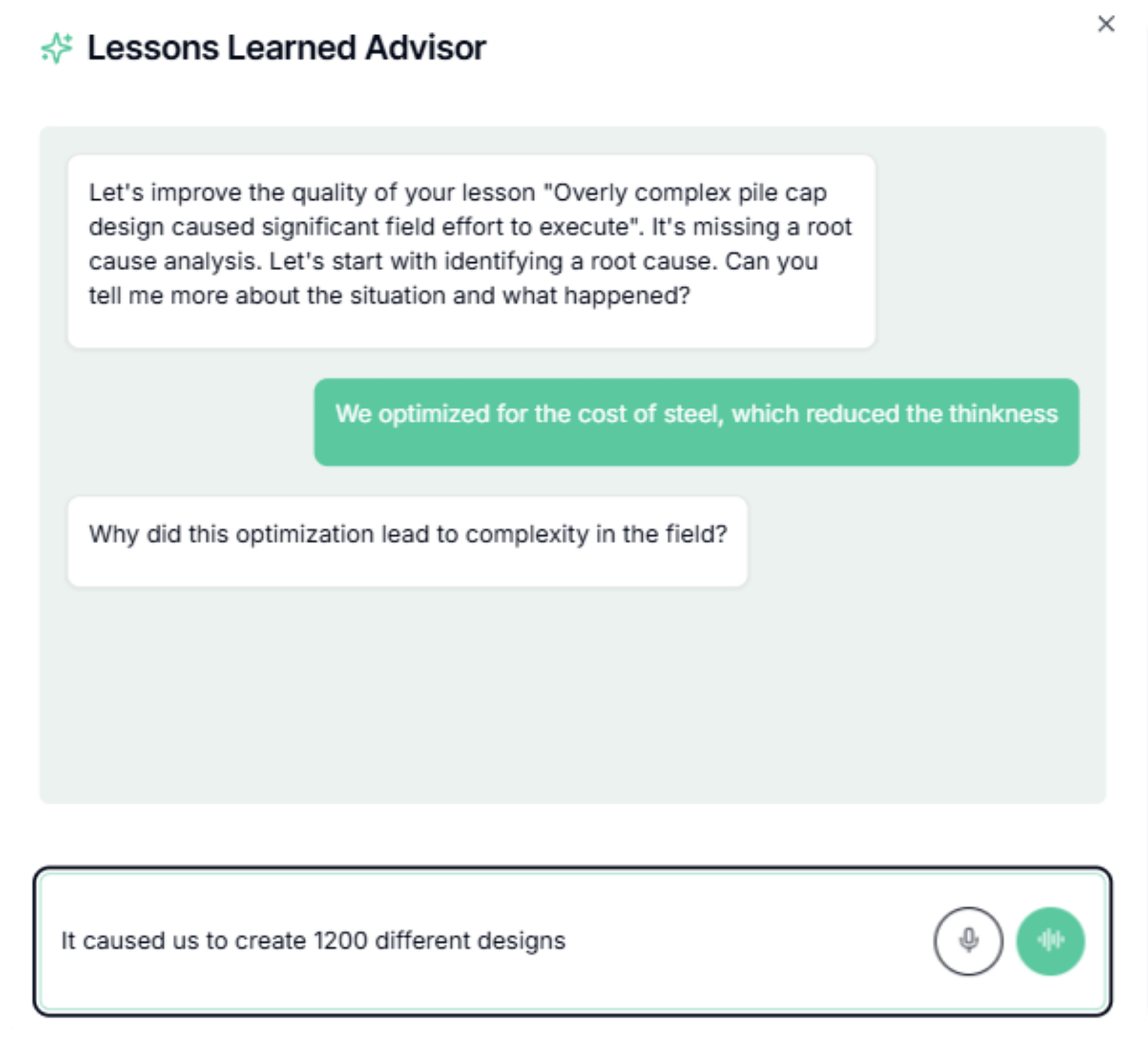 AI that suggests the most relevant lessons based on your project details, while providing insight into its impact, root cause, and suggested actions.